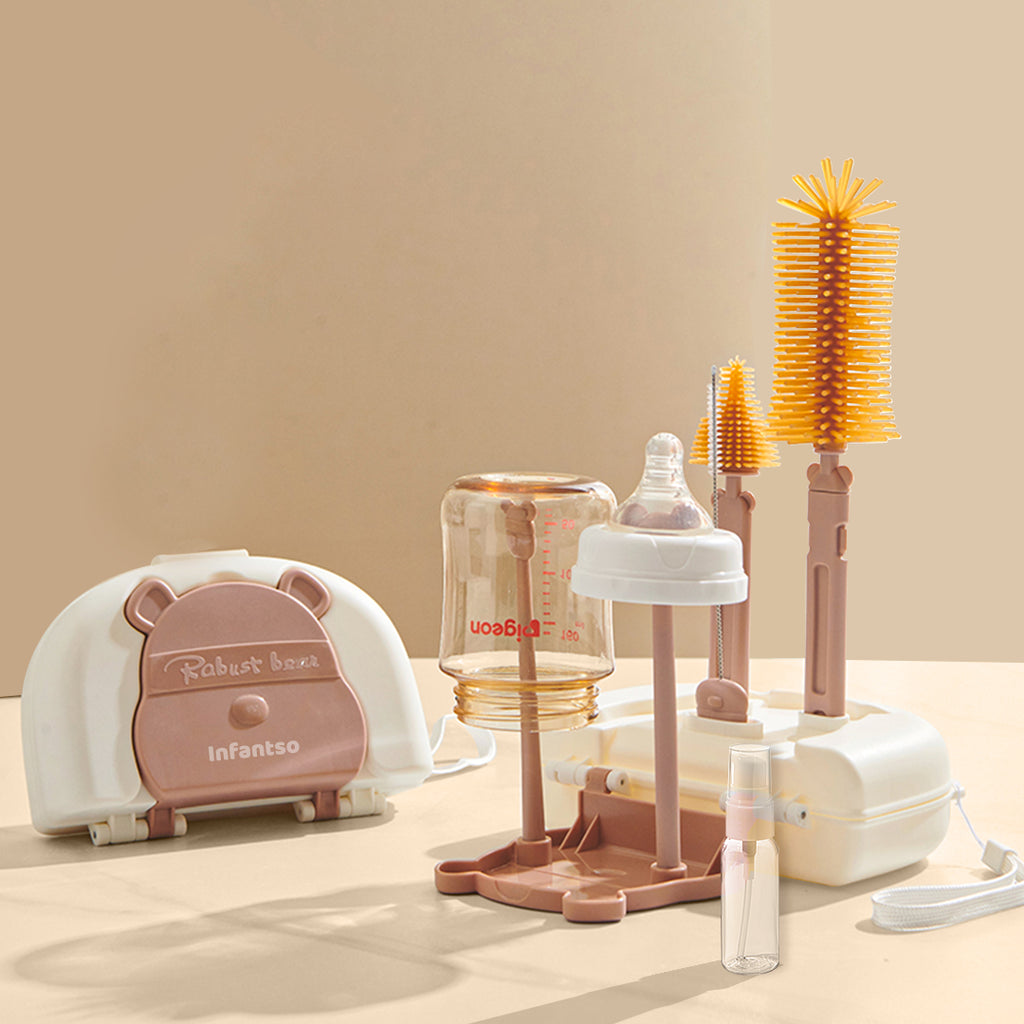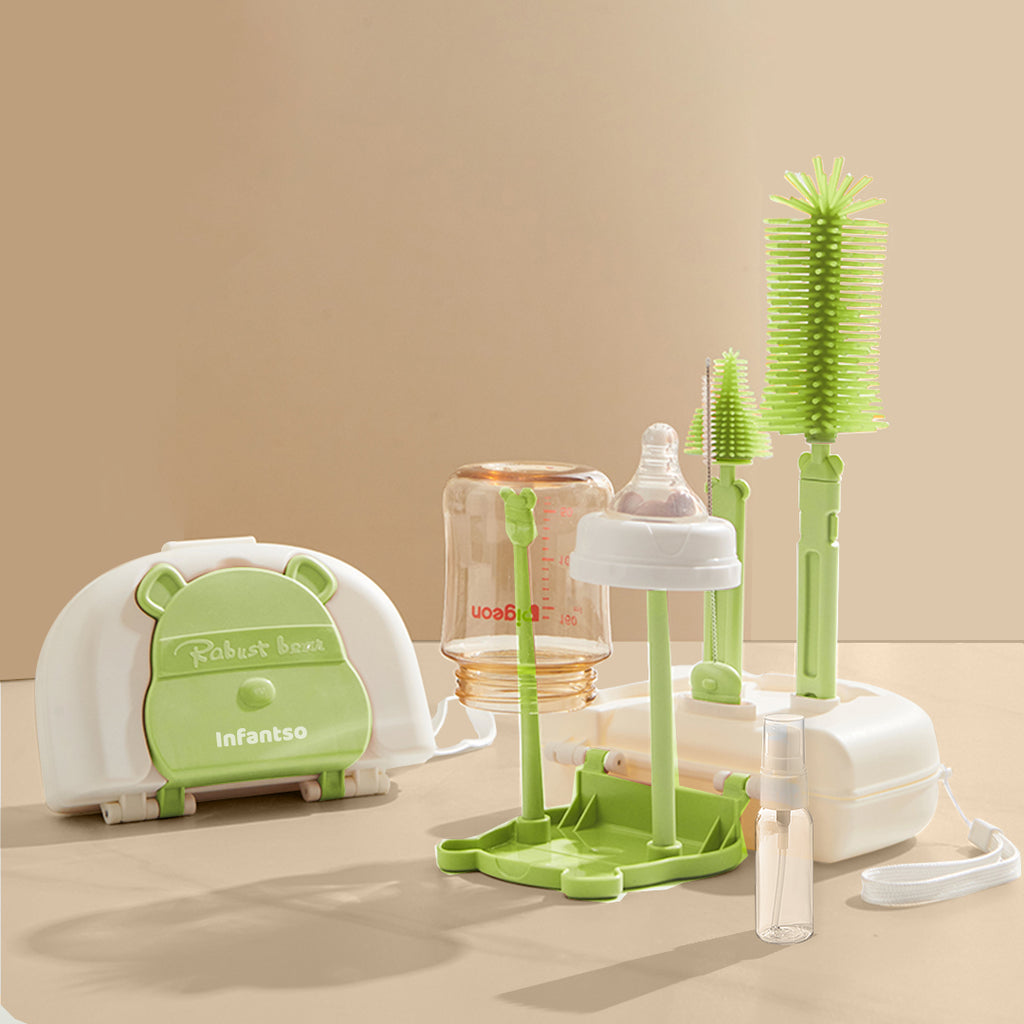 Keep your baby’s feeding essentials spotless with the Robust Bear Portable Bottle Cleaning Brush Set—a complete hygiene solution for modern parents. Designed with BPA-free, food-grade silicone and high-density nylon bristles, this kit ensures safe, gentle, and thorough cleaning of baby bottles, nipples, straws, and feeding accessories.