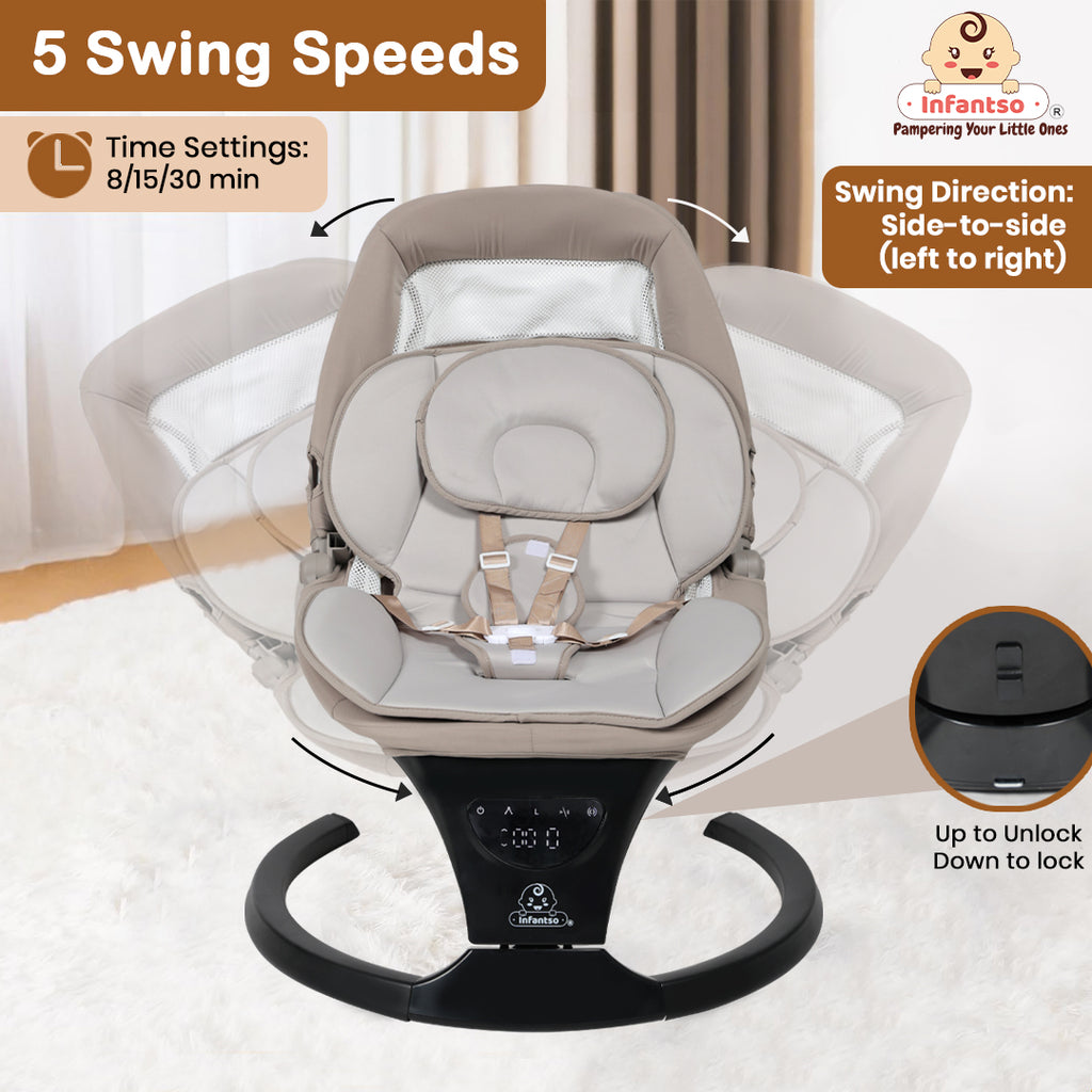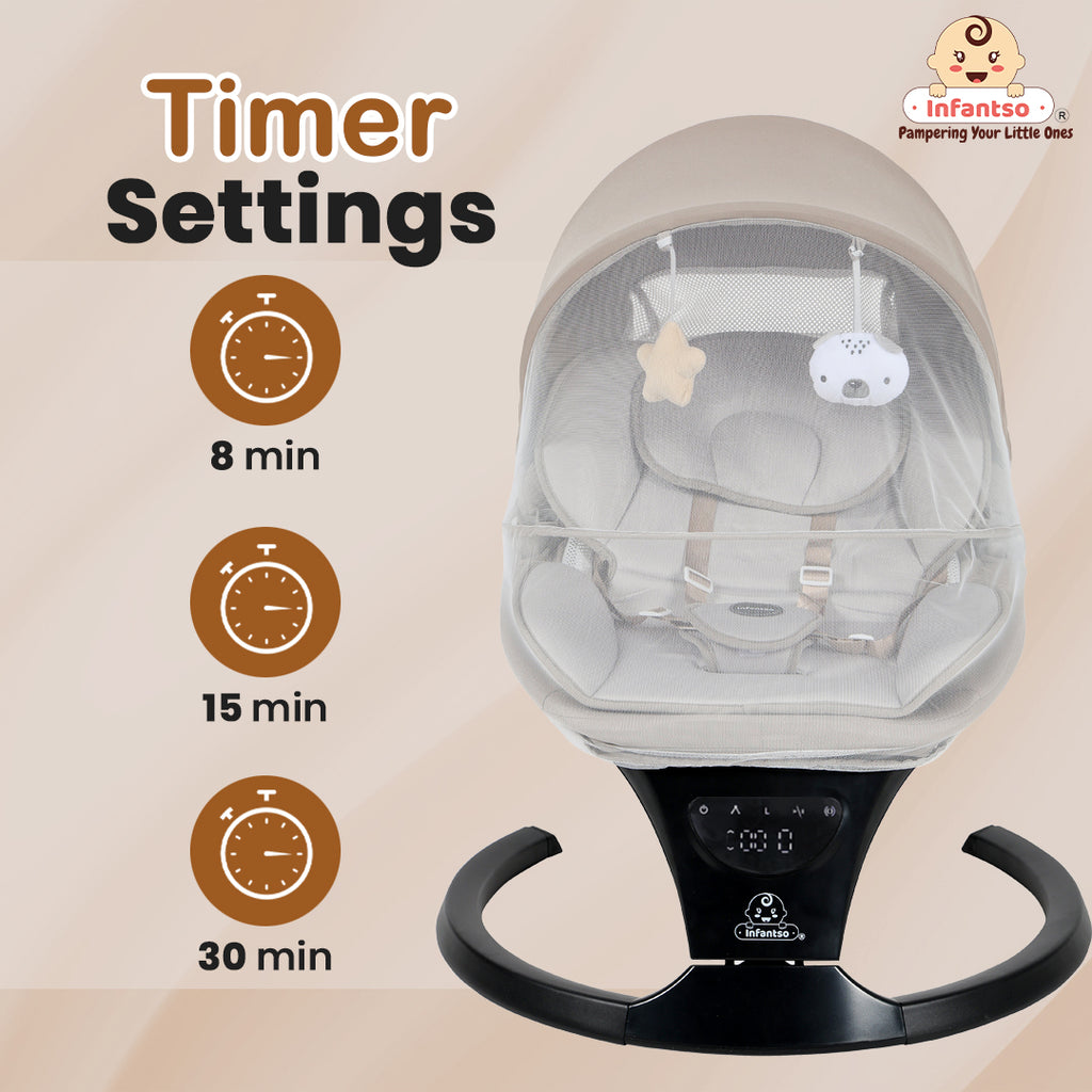 The timer settings (8/15/30 minutes) allow hands-free convenience, while the safety lock and cushioned seat with harness ensure your baby stays secure. Breathable mesh sides promote airflow, and the sleek design makes it a stylish addition to any nursery. Perfect for newborns and infants up to 12 months.